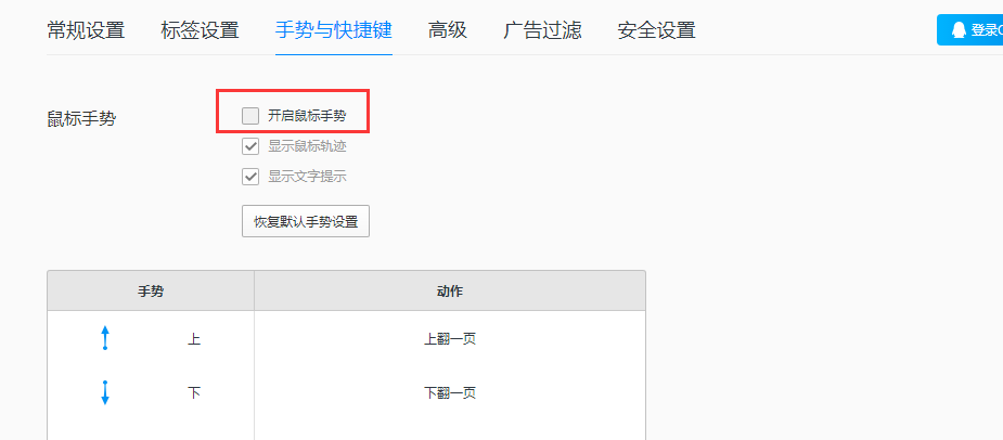 选择【手势与快捷键】,把【开启鼠标手势】前面的对勾去掉,关闭鼠标手势。