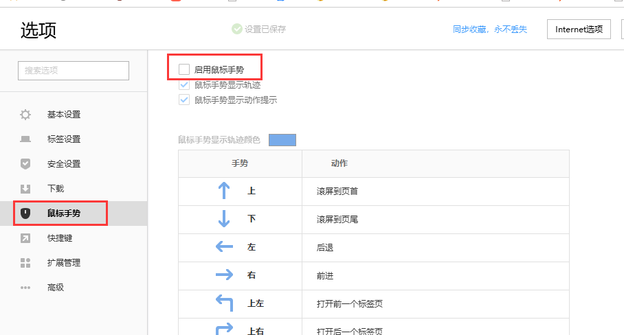 选择【鼠标手势】,把【启用鼠标手势】前面的对勾去掉,关闭鼠标手势。