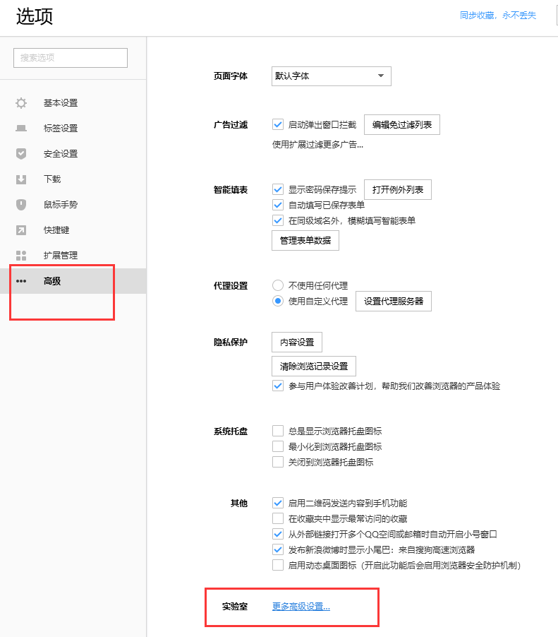 选择【高级】,找到【实验室】,点击【更多高级设置】。