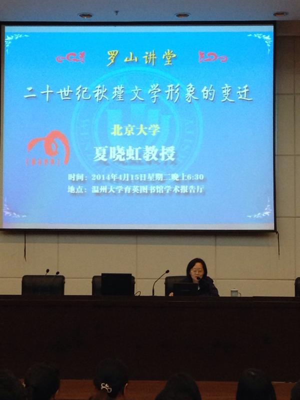 第一场讲座由夏晓虹教授主讲,她以时间为界限,将秋瑾文学形象的变迁分为六个阶段,并分别作了具体分析和阐述。夏教授首先介绍了晚清的秋瑾冤狱案,此时的秋瑾作为女子教育的先驱和爱国女杰的形象存在;而在整个二十世纪文学作品中的秋瑾形象则从“家庭革命第一人”开始,到民国初期的秋瑾形象已经从“家庭革命”向“政治革命”转移,落实在启发革命意识上;1930-1940年代关于秋瑾的文学形象用郭沫若的话说是“在社会解放中,求得妇女自身的解放”;1950-1980年代秋瑾形象从文学作品搬上了电影屏幕,主题也从革命传统教育转向了对人性的尊重,对秋瑾形象的理解也从一元变为多元。1990年代以后又有关于秋瑾的长篇小说问世,对其形象的认识有了新的突破。孙良好教授以“三个时代(晚清、民国、共和国)、三类作品(文学、戏剧、影视)、一个人物、百年风云”对本场讲座作了总结。