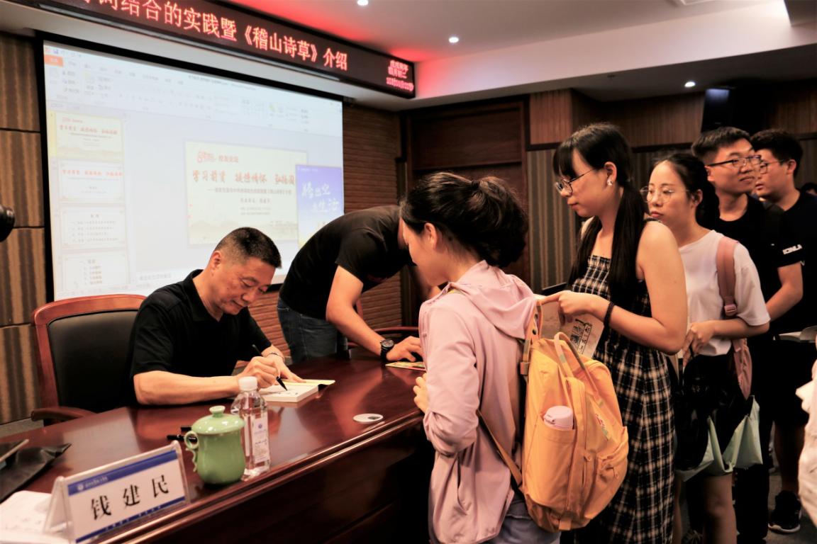 钱先生首先从自己的个人经历出发,结合自己任职教师15年,后踏入宦海浮沉的感想感悟,跟大家分享自己的作品《稽山诗草》的创作背景。当时,时任绍兴市常务书记的钱建民先生受绍兴历史文化的熏陶,开始“始结诗缘”,在后来的工作中,他发现绍兴的政务活动和交友应酬往往伴随着诗词,由此,便“入乡随俗”,从此沉浸诗海无可自拔。