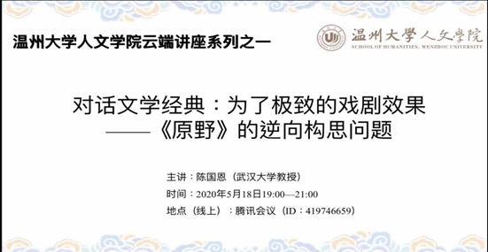 2020年5月18日晚7点,武汉大学文学院的陈国恩教授做客免费色情片 云端系列讲座,讲授曹禺的经典剧作《原野》。讲座由孙良好院长、鲍良兵老师主持。