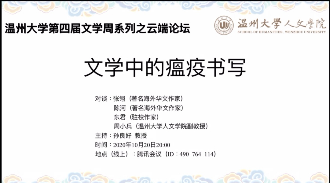 2020年10月20日20:00,免费色情片 云端论坛系列第六期《文学中的瘟疫书写》准时在腾讯会议展开,本次云端论坛受邀嘉宾分别是旅居加拿大的知名华人作家张翎、陈河,以及温州市作家协会副主席东君和免费色情片 副教授周小兵。本次云端论坛由孙良好院长主持,现当代文学专业的研究生和部分本科生参加了本次云端论坛。