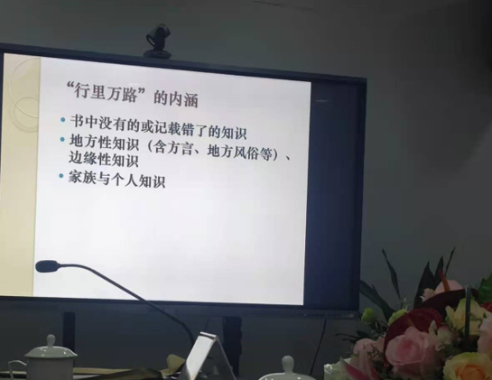 康保成教授首先对“读万卷书,行万里路”的典故出处进行了探究,通过列举董其昌、王直方、胡仔、王楙等人关于 “读万卷书,行万里路”的言论,将“剧情反转”清晰的表现在学生面前,从而对“读万卷书,行万里路”作出正确的解读。康保成教授提出“读书为先”的观点,并从“科举时代读书的功利性”“书是知识与智慧的结晶”“书面证据优于口头证据”和“ 文献史料优于口述史料”四个方面对其展开论述。在讲 “口述史”这一概念时,以《张学良口述史》为例,讲口述材料应与史料相互证应,谈学术研究过程中应广泛的搜集资料。又从“书中没有的或记载错了的知识”“地方性知识(含方言、地方风俗等)、边缘性知识”和“家族与个人知识” 三个方面列举多个实例以诠释“‘行万里路’的内涵”。如在“ 边缘性知识”方面,介绍了“女性不入族谱”“戏剧家不立传(汤显祖例外)”和“《四库全书》不收戏曲小说”等;在地方性知识方面,举苏轼和王安石对于秋菊描写的不同、南北方学生对于春天的不同感受是实例,启发学生在学习和研究中应当注意了解地域知识。此外康教授还谈及了一些个人的研究经验,比如古地名应以当地人发音为主,地方性知识应经过田野考察再去使用以避免出错等。