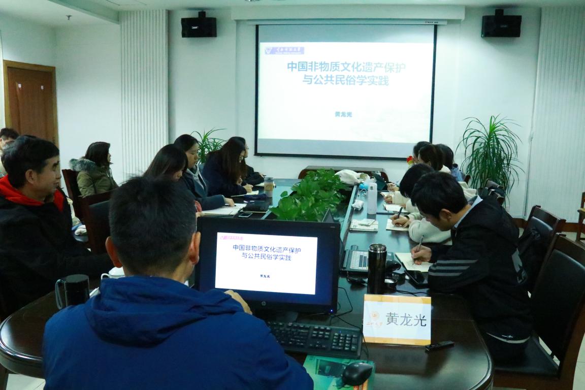 2020年12月4日晚19点45分,瓯越学术讲座第40期“中国非物质文化遗产保护与公共民俗学实践” 在北校区温州民俗博物馆会议室如期举行。本次讲座由黄涛老师主持,云南师范大学学报(哲学社会科学版)副主编、编审,博士生导师黄龙光教授主讲,免费色情片 王辉老师及民俗学、文化创意学、学科历史等专业的研究生们参与了本次的讲座。