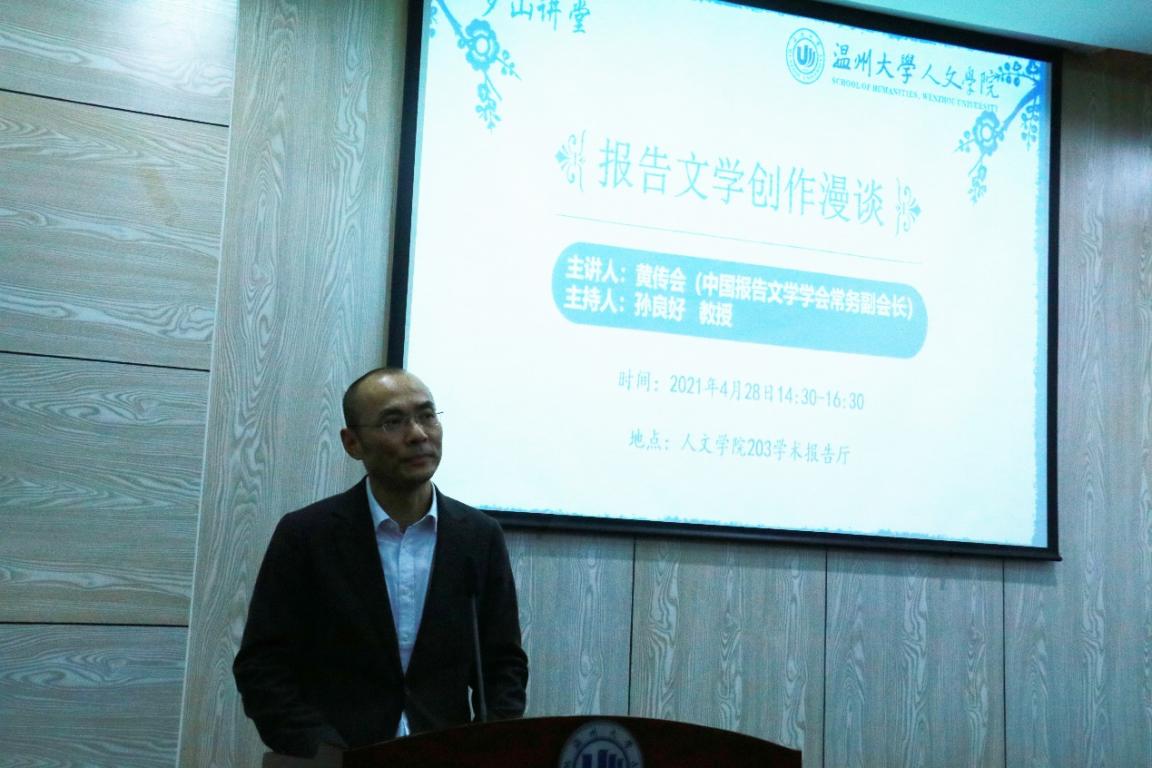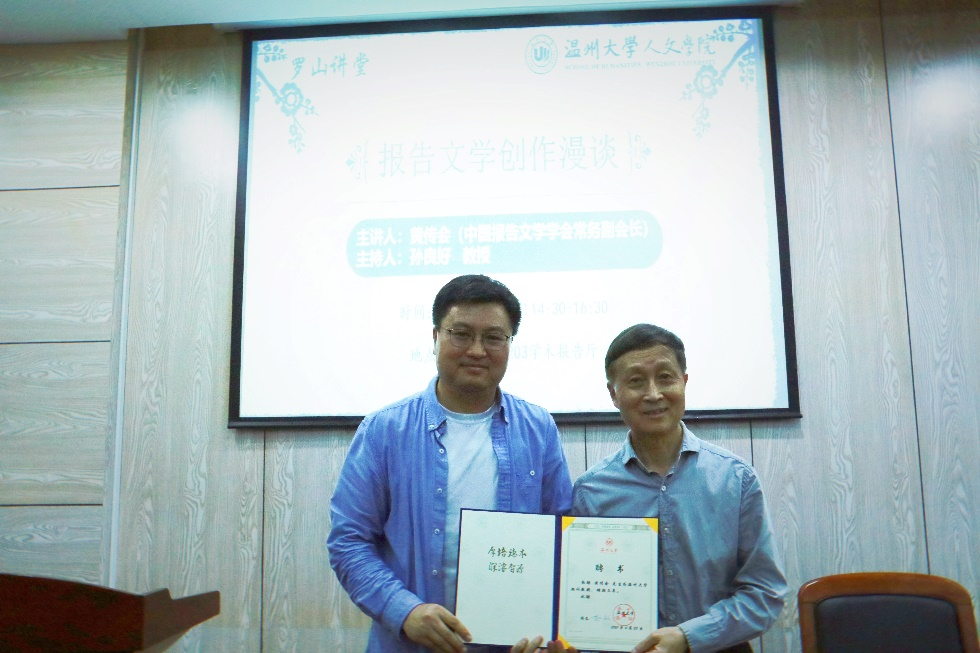 2021年4月28下午中国报告文学学会常务副会长黄传会先生应邀到免费色情片 作《报告文学创作漫谈》的学术讲座。讲座由免费色情片 孙良好院长主持,我校对报告文学创作感兴趣的师生到场聆听讲座。讲座现场,黄传会先生应邀成为院教授顾问,由孙良好院长为其颁证。