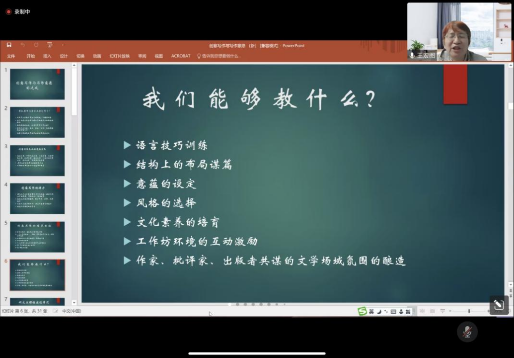 王教授围绕创意写作的潜力、培养目标以及教学内容三个方面,重点强调了创意写作可以教和不可教的内容:语言技巧、结构布局、意蕴、风格、文化素养、工作坊环境的互动激励,以及作家、批评家、出版者共谋的文学场域氛围的酿造等内容都是创意写作课程可以教授的;除此之外的,比如艺术家气质、神经感官系统的敏感度、运用语言的天赋、完成作品的意志、表达的欲望、机缘等等,是创意写作无法教授的东西。