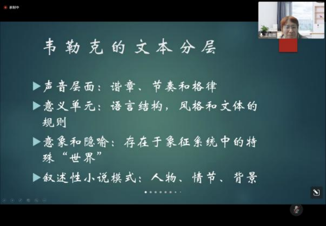 王教授提倡运用现象学方法,分析作品文本内部的层面——声音、意义单元的组合、表现的对象、作者的观点、形而上的层面。于声音而言,诗歌的节奏格律是表现得较为明显的;在叙述性作品中,作者将设计的声音演化成词语跟段落的意义单元。此外,王教授也在韦勒克文本分层中举例说明了诗歌对于意象和隐喻的典型演绎。