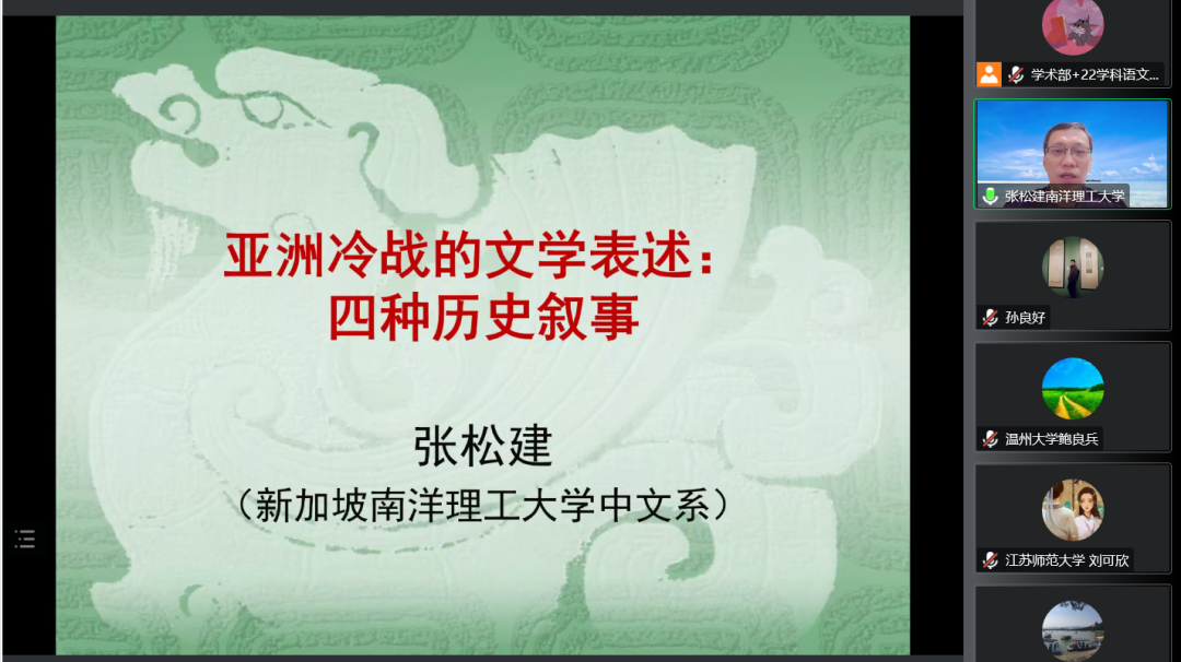 2022年11月19日14:30,新加坡南洋理工大学中文系终身职副教授,博士生导师张松建老师受邀为免费色情片 师生带来了一场题为“亚洲冷战的文学表述:四种历史叙事”的精彩讲座。本次讲座由免费色情片 孙良好院长主持,鲍良兵副教授及校内外众多师生参与本次讲座。