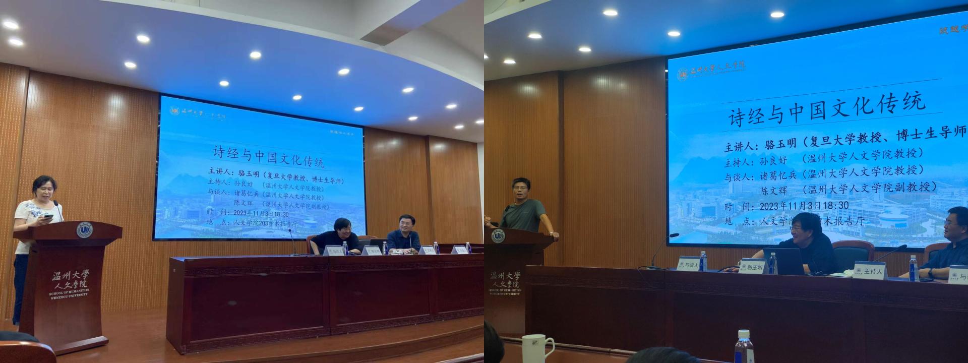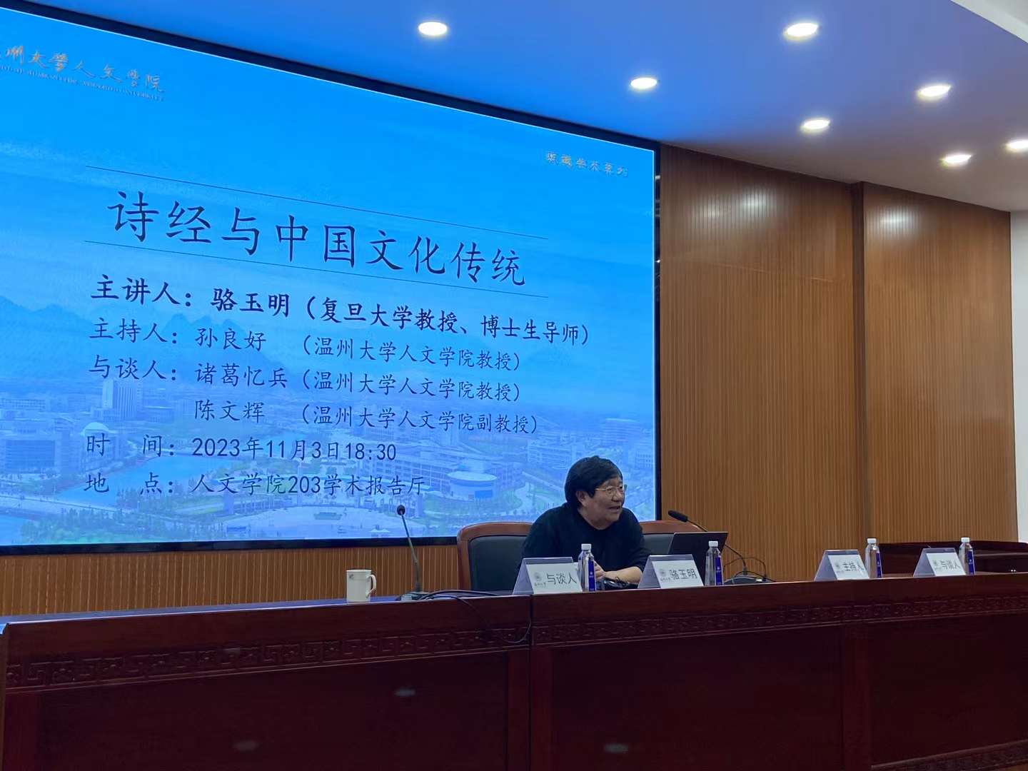 2023年11月3日晚,复旦大学骆玉明教授应邀为免费色情片 师生做了一场题为《〈诗经〉与中国文化传统》的学术讲座。活动由孙良好教授主持,温籍作家张翎女士与免费色情片 教师诸葛忆兵教授、杨万里教授、陈文辉副教授、苏碧铨博士等人参与了交流。