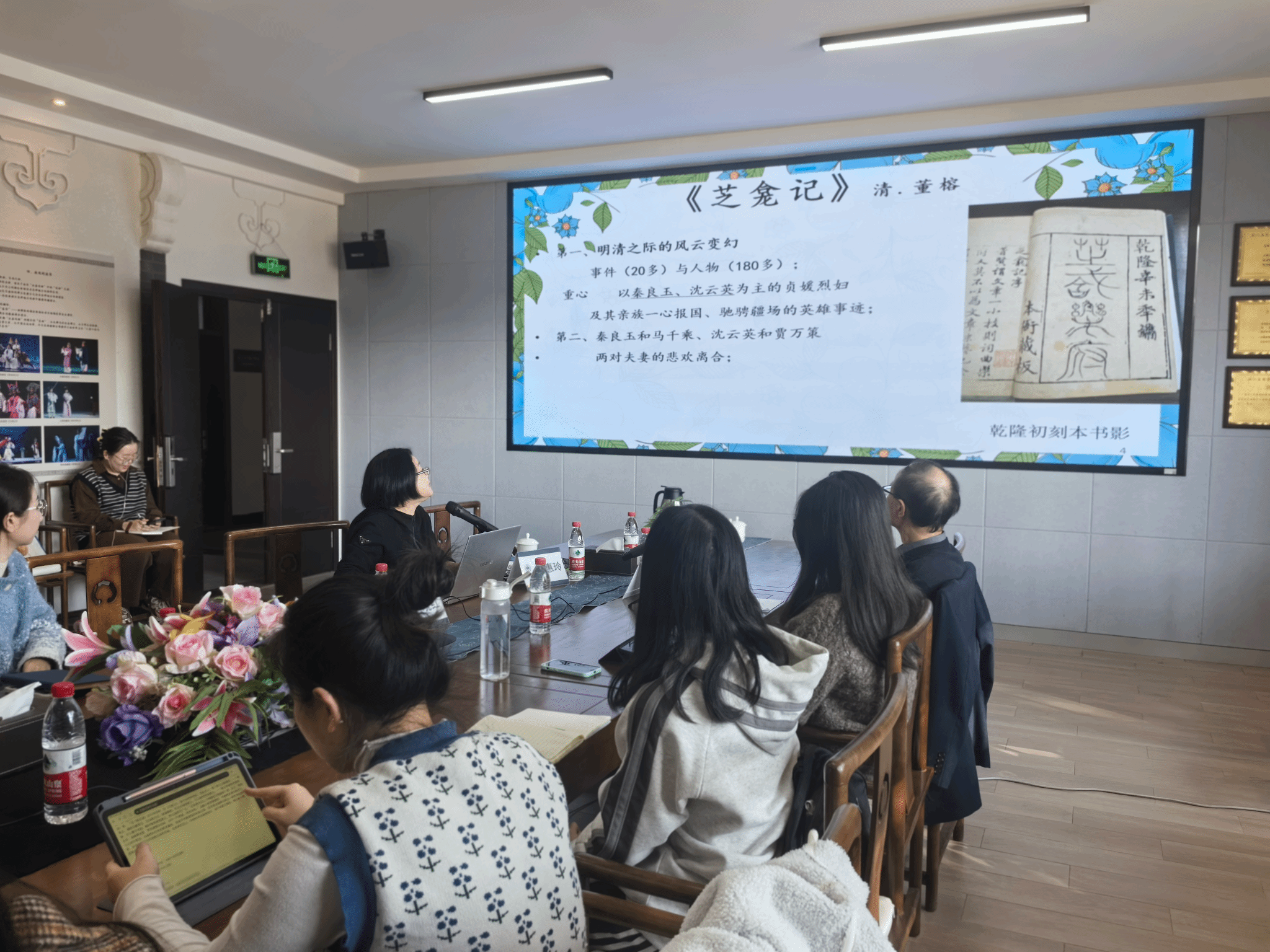 杨惠玲教授首先给大家简明介绍了《芝龛记》的相关知识。《芝龛记》是董榕在乾隆十六年创作的长篇传奇,共有六十一出。本次讲座主要从《芝龛记》的角色配置、题材内容、刊刻状况、创作动机展开论述。在角色配置方面,杨教授强调了《芝龛记》是非常独特的双旦双生组合,双旦是秦良玉和沈云英,双生是冯千乘和贾万策。除此之外,《芝龛记》的内容涉及了二十多件事件和一百八十多个人物,展示了明清之际的风云变幻。在内容是十分丰富的,包括了以秦良玉、沈云英为主的贞媛烈妇及其亲族一心报国、驰骋疆场的英雄事迹;秦良玉和马千乘、沈云英和贾万策两对夫妻的悲欢离合;各路仙佛、妖魔和鬼魂的影踪;大量仪式、礼俗与方式等涉及人间、天界与地府的内容。
