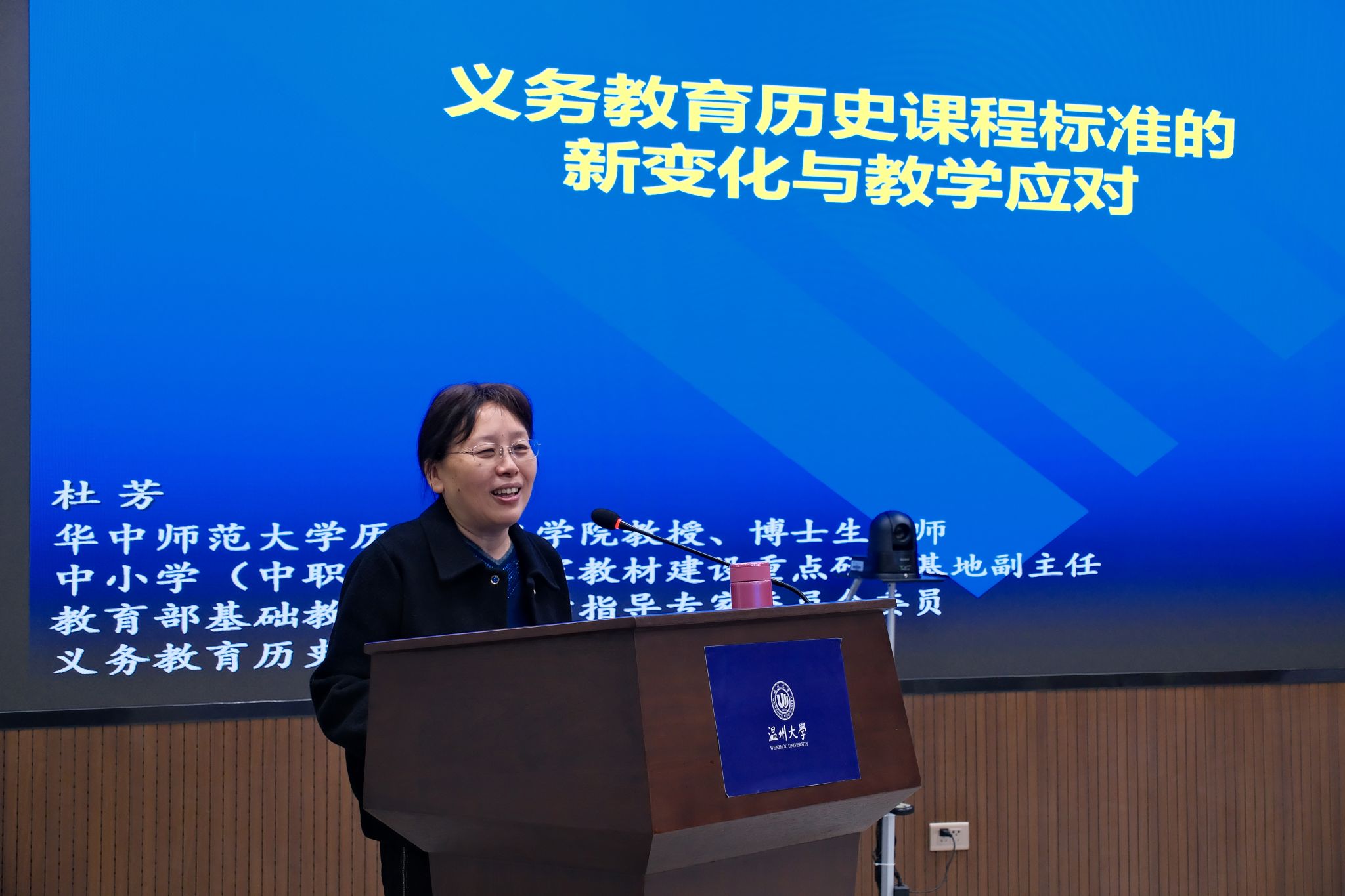 2023年12月16日上午,华中师范大学历史文化学院杜芳教授应邀在我校育英图书馆作了题为《义务教育历史课程标准的新变化及教学应对》的精彩讲座。本次讲座由免费色情片 尤育号教授主持,历史学及相关专业本科生、研究生40余人参加了讲座。