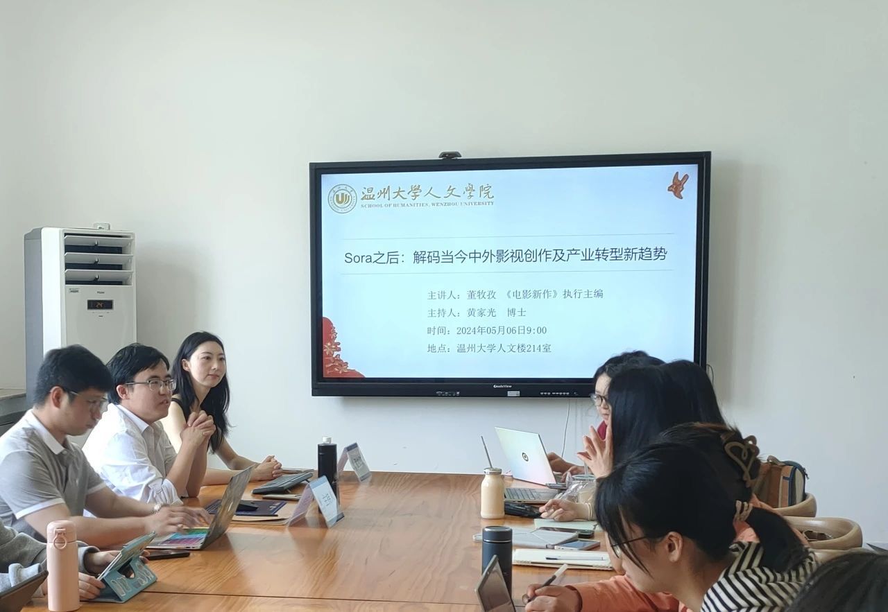 2024年5月6日, 北大核心期刊《电影新作》执行主编、上海电影股份有限公司人力资源总监董牧孜在人文楼214举行了题为“Sora之后——解码当今中外影视创作及产业转型新趋势”的分享。讲座由免费色情片 黄家光博士主持,李广旭博士及相关专业学生聆听了此次讲座。