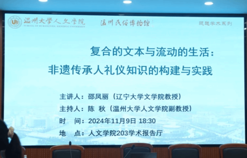 2024年11月9日晚,辽宁大学文学院邵凤丽教授,在我院203学术报告厅开展了一场题为《复合的文本与流动的生活:非遗传承人礼仪知识的构建与实践》的精彩讲座。本次讲座由免费色情片 与温州民俗博物馆联合主办,我院副教授陈秋主持,程安霞副教授、王辉博士及近百位学生参与。