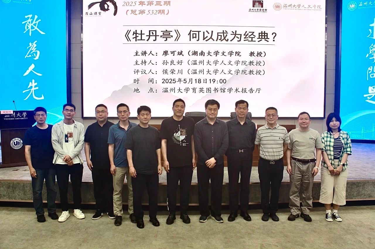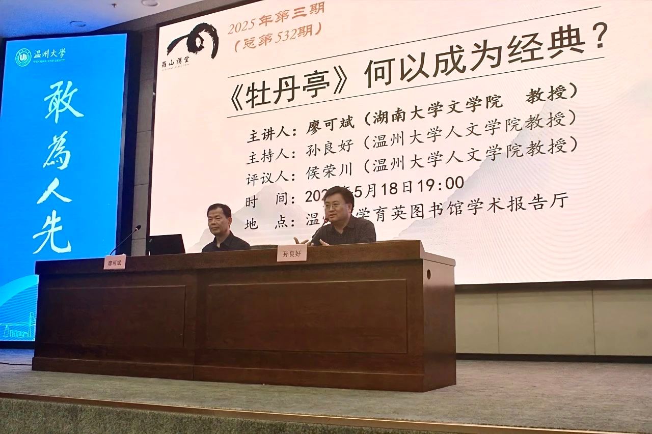 2025年5月18日晚,湖南大学文学院廖可斌教授应邀在我校育英图书馆学术报告厅,作了一场题为“《牡丹亭》何以成为经典”的专题讲座。本次讲座由孙良好教授主持,侯荣川教授参与探讨。本次讲座吸引了校内外百余名师生前来聆听。