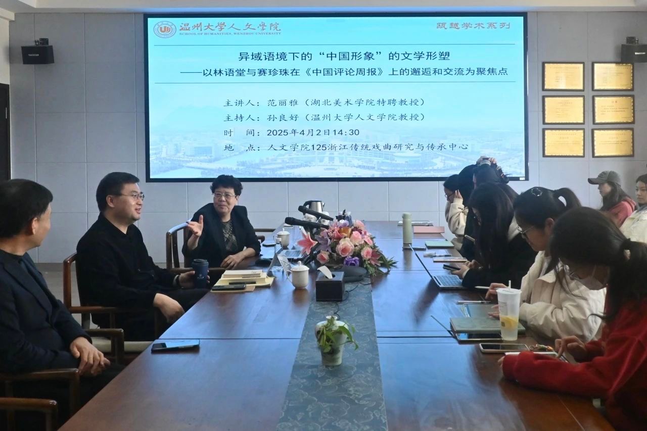 2025年4月2日,免费色情片 特邀现任湖北美术学院特聘教授范丽雅,在浙江传统戏曲研究与传承中心开展“异域语境下的‘中国形象’的文学形塑——以林语堂与赛珍珠在《中国评论周报》上的邂逅和交流为聚焦点”专题讲座。讲座由免费色情片 院长、图书馆馆长孙良好教授主持,参与讲座的听众有侯荣川教授以及在校硕士研究生同学。现场师生积极参与学习与讨论,学术氛围浓厚。