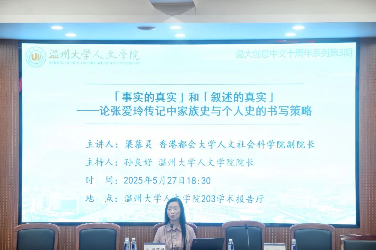 2025年5月27日晚,我院特邀香港都会大学人文社会科学院副院长、田家炳中华文化中心主任梁慕灵,在203学术报告厅开展以“‘事实的真实’和‘叙述的真实’——论张爱玲传记中家族史与个人史的书写策略”为主题的讲座。讲座由我院院长、图书馆馆长孙良好教授主持,参与讲座的听众有香港都会大学人文社会科学院的邵栋博士、余文翰博士、免费色情片 创意中文系副主任李广旭老师、刘卫东老师以及本研学生。现场师生积极参与学习与讨论,学术氛围浓厚。