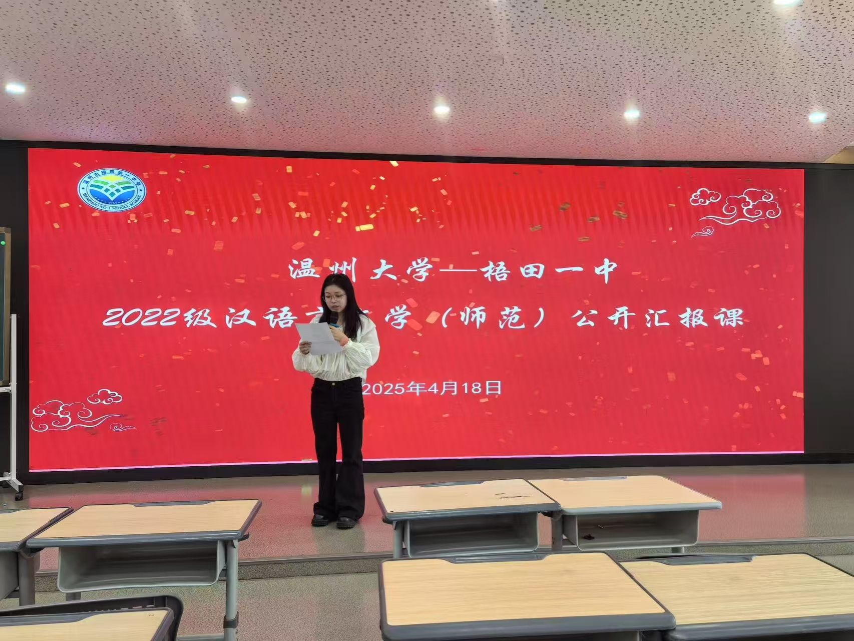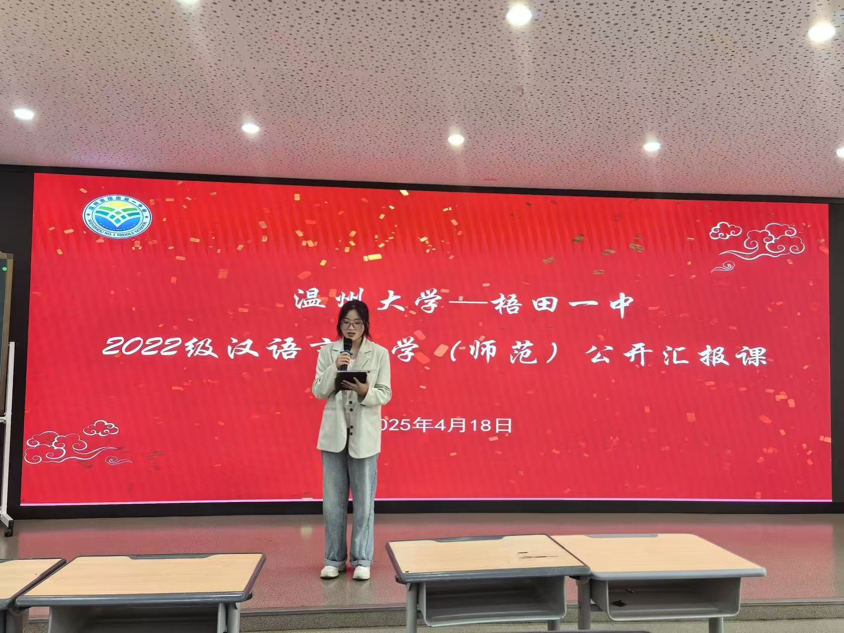 在实习活动的最后环节,实习生代表赵文希、麻嘉颖同学上台致谢。她们首先向梧田一中表达了由衷的感激之情,指出学校为实习生搭建了坚实的实践平台,其深厚的文化底蕴、规范的教学管理以及倾注心血的育人精神,均给实习生们留下了深刻印象并获得高度好评。随后,她们对指导老师表达了诚挚的谢意,老师的倾囊相授与示范引领,让实习生们真切感受到了“以生为本”的教学智慧。最后,她们感谢了学生们在课堂上的积极配合与课后的真诚反馈。两位代表表示,将带着此次实习的宝贵收获继续前行,不负教育使命,传承薪火荣光。