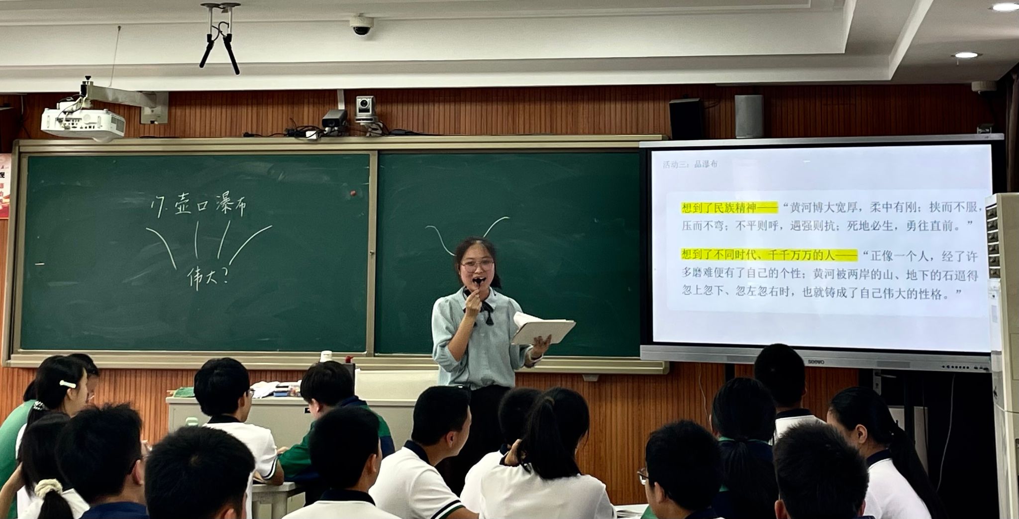 陈羽姿同学以“制作视频脚本”为情境载体,将游记“游踪、游观、游感”三要素巧妙融入教学。课堂上,她引导学生通过圈画关键词梳理作者游踪,结合“主镜头”等影视元素解析文本,让学生在“镜头语言”与“文字语言”的交织中,身临其境感受壶口瀑布的磅礴之景与作者的情感脉络。通过“拟定脚本大纲”“配解说词”“补全解说词”等互动环节,学生积极参与,深入分析文本,不仅掌握了游记的三要素,更在情境化学习中深化了对文本的理解,体会了黄河之景的独特魅力。