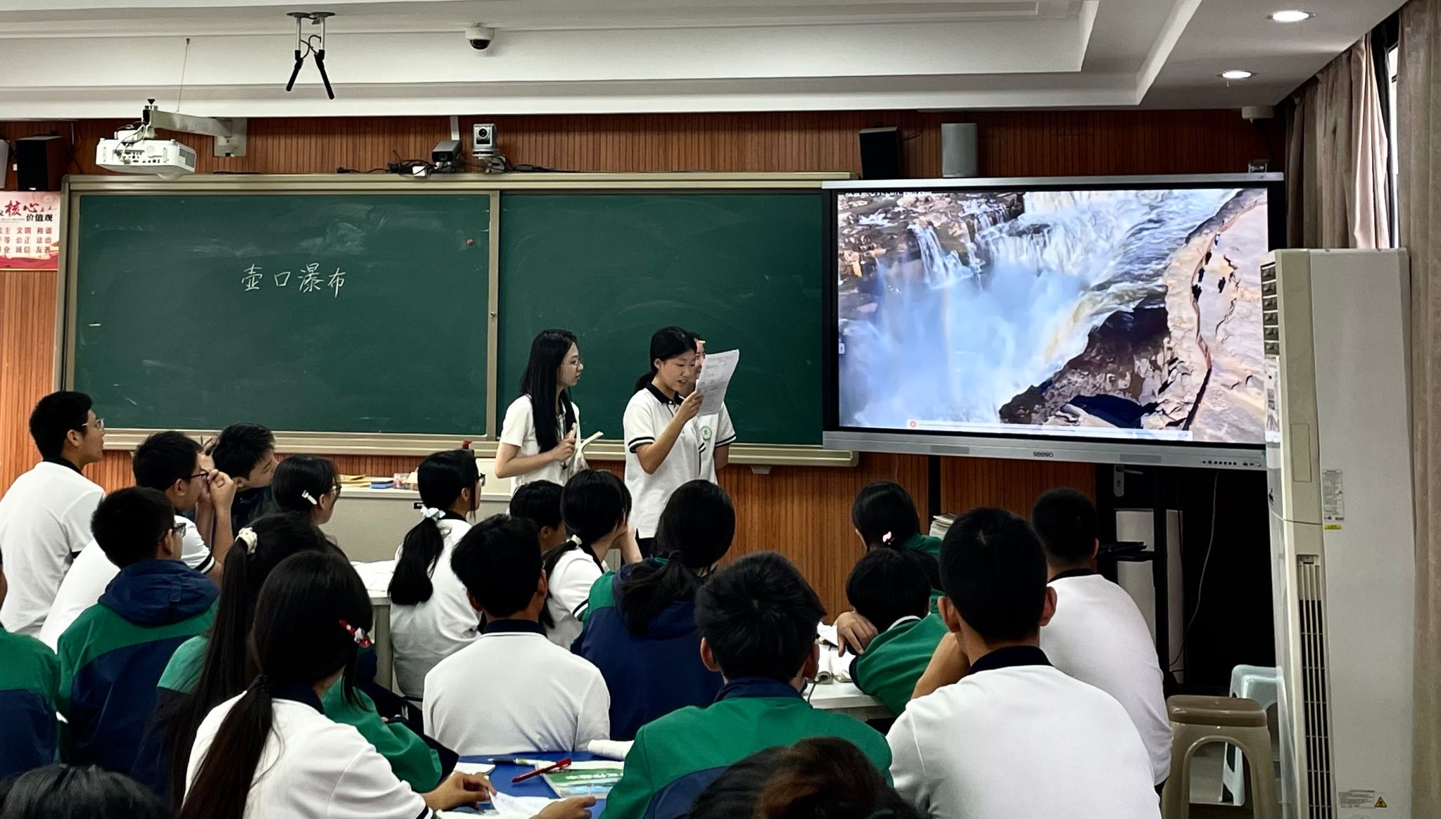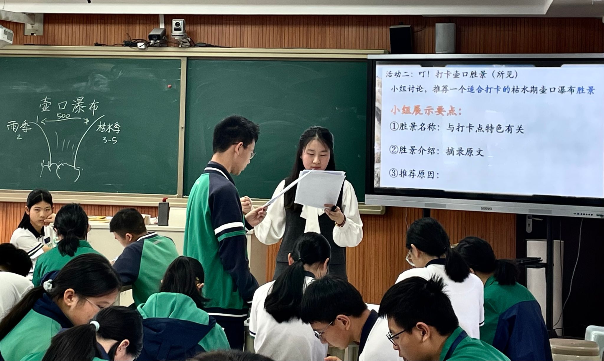 王一涵同学以“设计旅游攻略”为情境主线,以“所至、所见、所感”为线索串联课堂,带领学生开启了一场别开生面的“壶口瀑布之旅”。她带领学生化身为“旅游规划师”,通过绘制游览路线图、标注景点特色、撰写攻略文案等方式,梳理作者游览轨迹,品味文章的语言艺术。通过对文中精准动词、修辞手法等的赏析和朗读,学生们深刻感受到了壶口瀑布的磅礴气势,同时也提高了对语言文字的鉴赏能力。这种新颖的教学方式,激发了学生的学习兴趣,让课堂充满了活力。