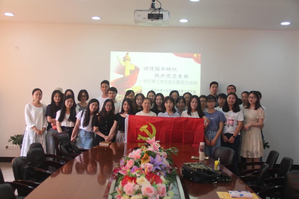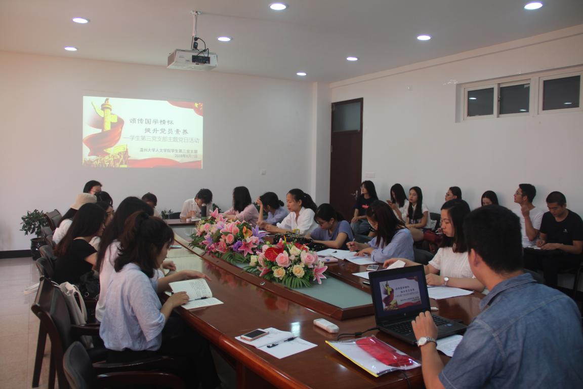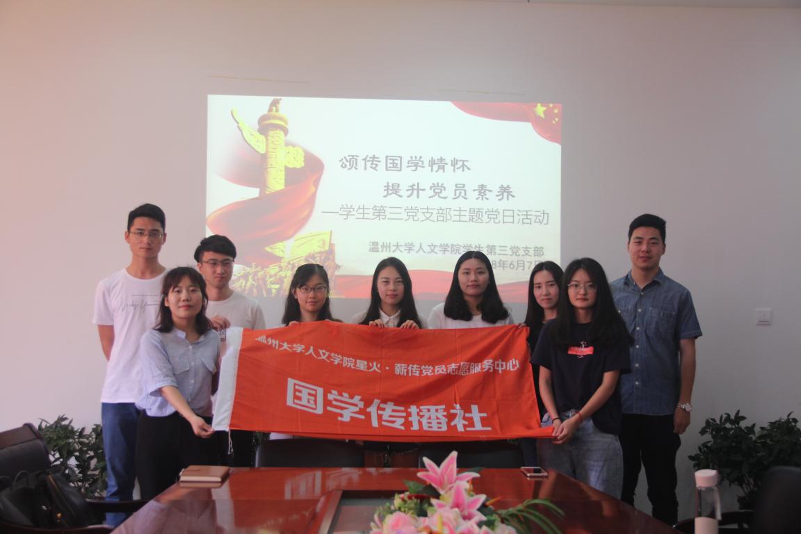 2018年6月7日上午,免费色情片 学生第三党支部携手国学传播社在人文楼213会议室成功开展了“颂传国学经典 提升党性修养”主题党日活动。本次活动由学生第三党支部书记徐珍组织安排,学生第三党支部全体学生党员共同参与其中,并作了分享交流。