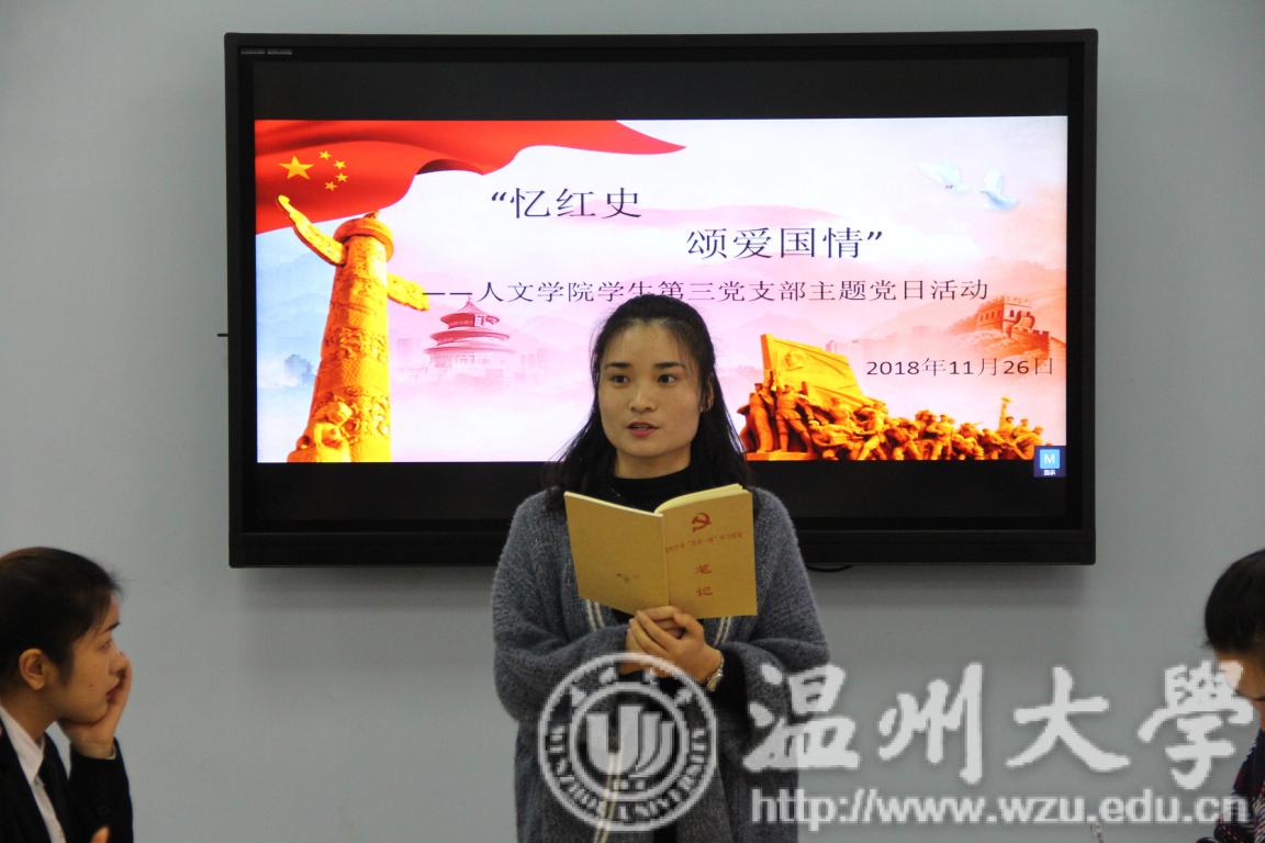 11月26日下午,免费色情片 学生第三党支部在外语楼党员之家221会议室成功召开了“忆红色革命史,颂爱国主义情”主题党日活动。本次党日活动由支部书记徐珍主持,学生第三党支部全体党员参加。