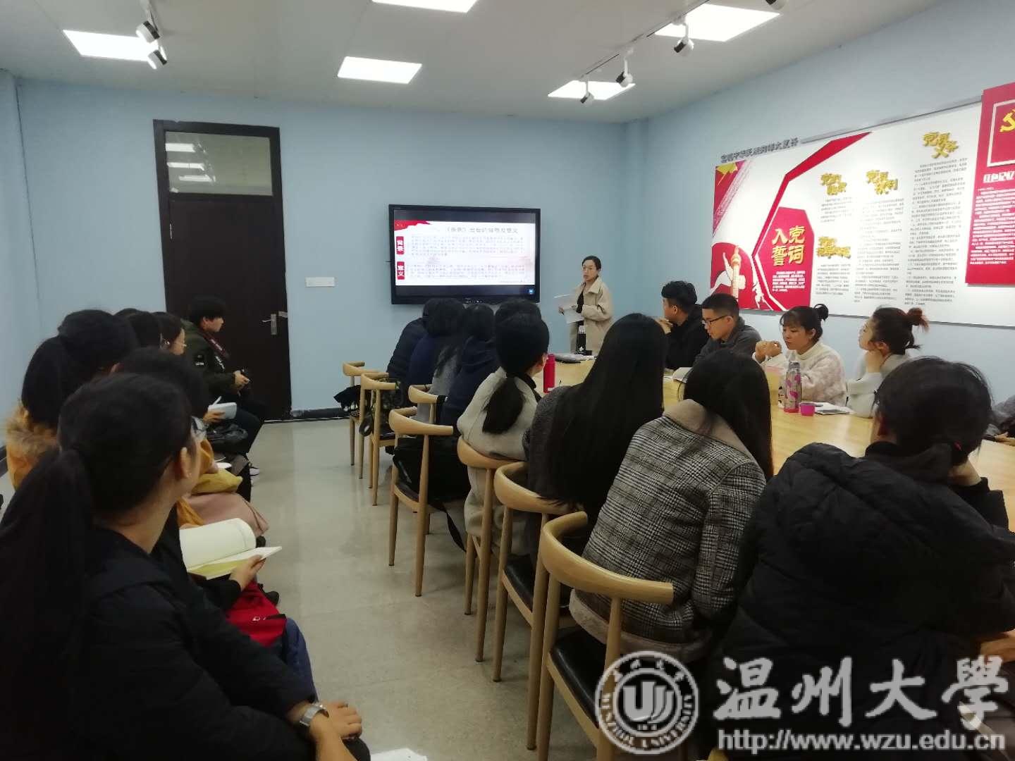 2018年12月23日下午,免费色情片 学生第二党支部举行“学习《中国共产党支部工作条例(试行)》”主题党日活动。本次主题党日活动以党课的形式开展,由支部书记陈赛君进行宣讲。
