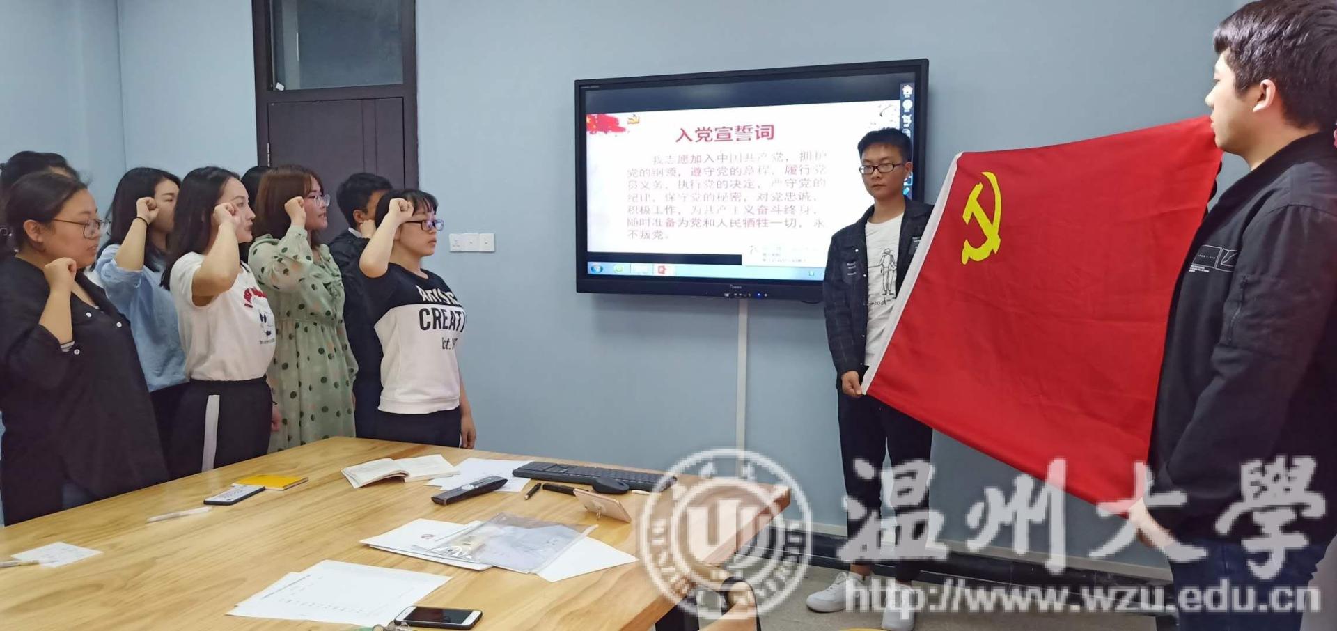 首先,曹清清等10名同志依次上台就自身对党的认识、入党动机、家庭情况,主要社会关系、现实表现以及有无需要向党组织说明的特殊问题进行发言,表达了他们强烈的入党意愿以及为社会主义奋斗终身的决心。同时,入党介绍人依次汇报了各位发展对象的考察情况并对其进行了客观的评价,指出了他们身上的优点以及不足之处,与会党员也就这10名同志能否入党发表了自己的看法,支部具有表决权的19名党员同志依次进行了无记名投票,票决过程严肃透明,做到了公平、公正、公开。会上,10名发展对象成功发展为预备党员。在支部书记李林军的带领下,10名预备党员佩戴党员徽章,面对党旗,进行了庄严的入党宣誓。