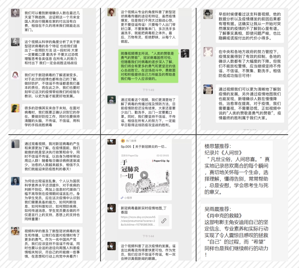本次党日活动通过线上视频科普以及经验交流分享的方式,在增强党员相关科学素养的同时,也引导党员同志们对家人及朋友进行科普,在一定程度上阻断了网络上某些谣言的传播。在这个特殊时期,大家虽然无法聚集在一处,但每个人都是一面独立的旗帜,在各自的岗位和领域中散发着自己的光和热。相信通过这次活动,第四党支部的各位同志将会更清楚地意识到自己应该做的事情,为人民,为社会,为国家献上自己的一份力量。