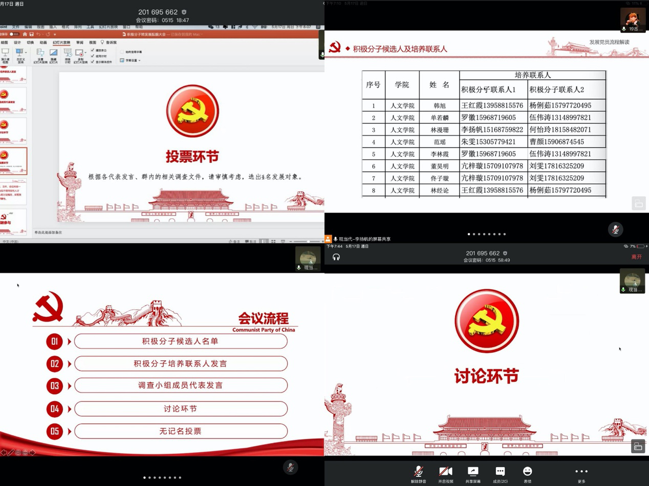 2020年5月17日19点,免费色情片 学生第三党支部通过线上形式开展了免费色情片 学生第三支部发展对象推优大会。本次会议由支部书记李扬帆主持,通过腾讯会议平台进行,会议内容分为对应积极分子联系人发言,调查组成员汇报了解情况,其他党员根据了解发言和进行无记名投票四个部分。在强调本次会议的推优纪律后,会议正式开始。