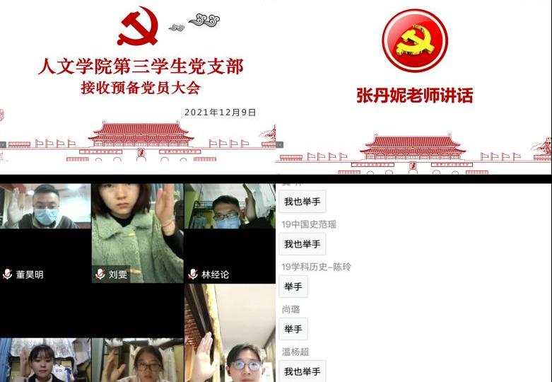 2021年12月9日,免费色情片 学生第三党支部于线上开展了发展对象转预备党员的支部大会。由于新冠疫情影响,本次会议以线上方式进行。会议由支部书记李扬帆主持,支部指导老师张丹妮、支部全体党员参加了此次大会。
