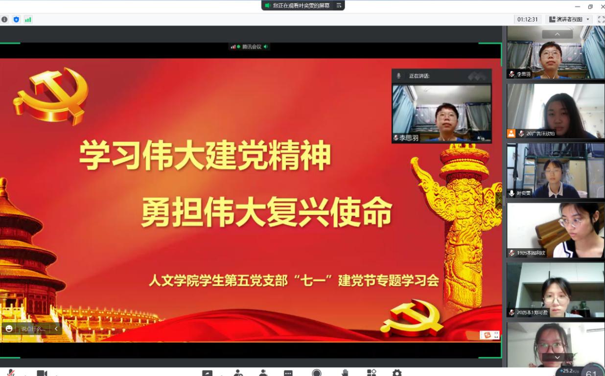 7月1日下午14:00,免费色情片 学生第五党支部在腾讯会议开展主题为“学习伟大建党精神,勇担伟大复兴使命”的专题学习会。会议由支部代理书记叶奕雯同志主持。