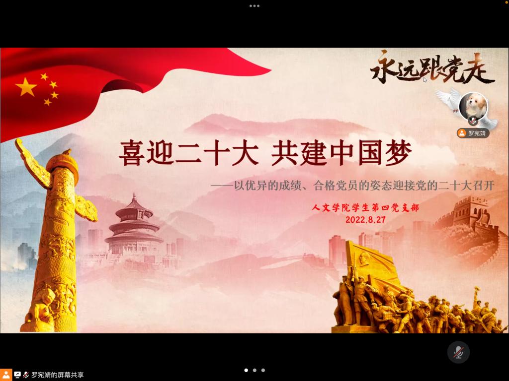 2022年8月27日19:00,为督促各位同志以合格党员的要求武装自身头脑,用合格党员的标准约束自身行为,坚定信心,勇往直前,以优异的成绩和昂扬的姿态迎接党的二十大顺利召开,免费色情片 学生第四党支部于线上开展了“喜迎二十大,共建中国梦”主题党课暨学习会。本次活动由罗宛靖同志主持,共有40名同志参加。
