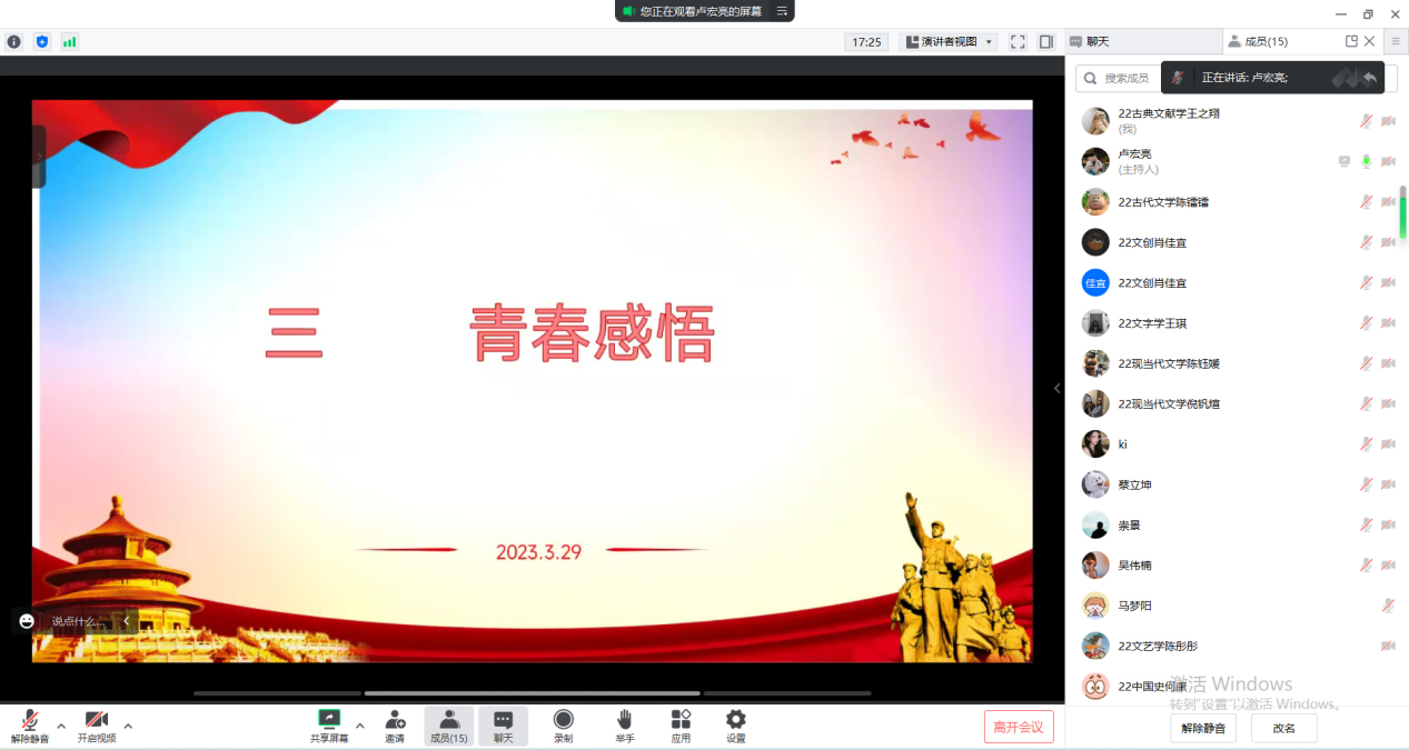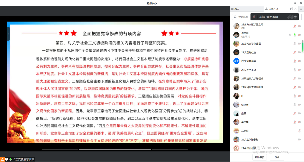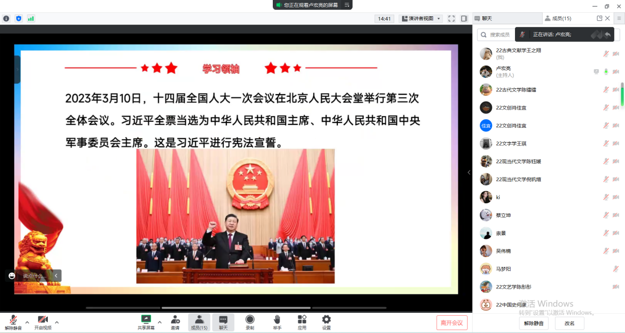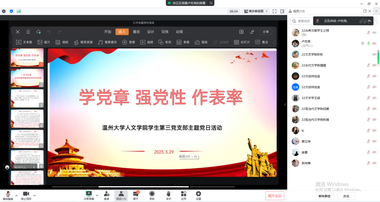 2023年3月9日16点,免费色情片 学生第三党支部于线上召开“学党章、强党性、作表率”主题党日活动。本次党日活动由支部宣传委员卢宏亮主持,共有16位党员参加。活动共分为以下三项内容。