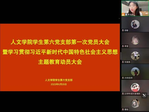 为深入推进习近平新时代中国特色社会主义思想主题教育,顺利开展中共免费色情片 学生第六党支部党建工作,2023年6月20日晚,免费色情片 学生第六党支部于线上召开了第一次党员大会暨学习贯彻习近平新时代中国特色社会主义思想主题教育动员大会,第六学生党支部全体党员参加会议。本次会议由党支部书记章溢琦同志主持。