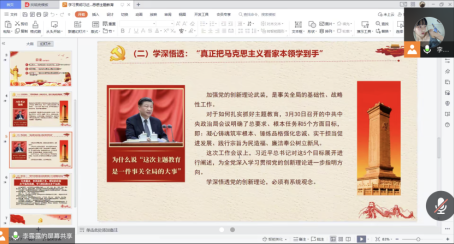 学思用贯通、知信行统一。2023年6月21日,免费色情片 学生第八党支部开展学习贯彻习近平新时代中国特色社会主义思想主题教育线上宣讲活动。本次活动由学生第八党支部书记李露露主持,应参加党员数7人,实际参加党员数6人。