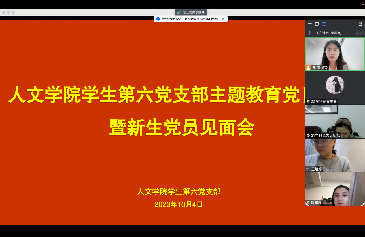 为贯彻落实教育部《关于举办2023年高校“礼敬中华优秀传统文化”宣传教育活动的通知》以及免费色情片 党委关于学习贯彻习近平新时代中国特色社会主义思想主题教育动员的部署要求,经研究决定,免费色情片 学生第六党支部于10月4日晚召开支部党员大会暨十月主题党日活动。本次会议由党支部书记章溢琦同志主持。