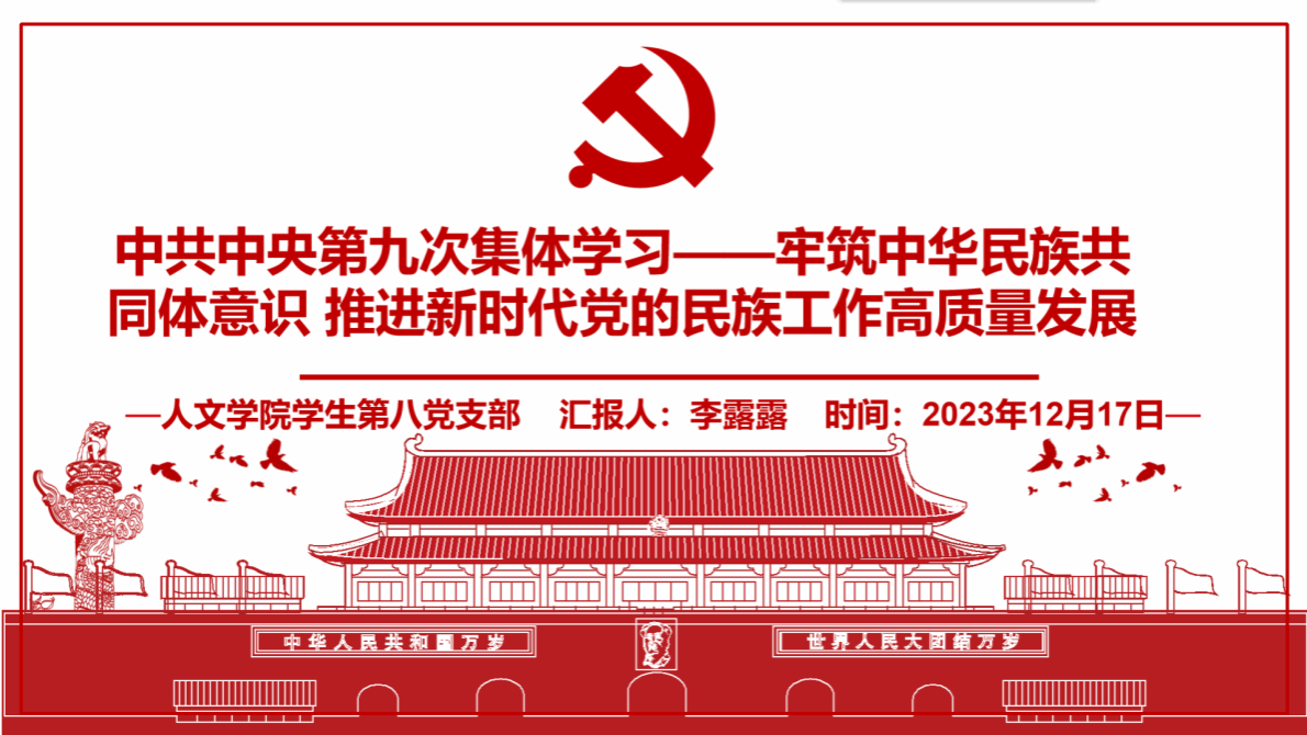 为深入学习习近平总书记在中共中央政治局第九次集体学习时的重要讲话精神,推动学习贯彻习近平新时代中国特色社会主义思想主题教育走深走实,推动深化政治理论学习入心入脑、走深走实、见行见效,2023年12月17日晚,免费色情片 学生第八党支部于腾讯会议开展了“铸牢中华民族共同体意识,推进新时代党的民族工作高质量发展”十二月主题党日活动。