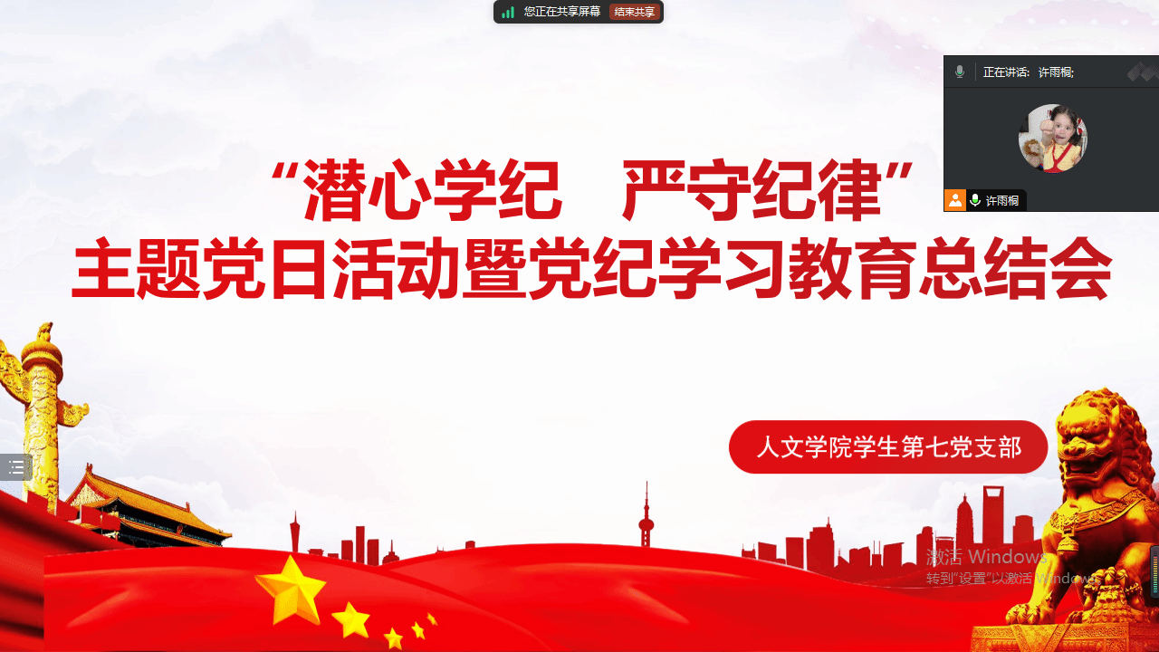 为深化“循迹溯源学思想促践行”行动,深入学习习近平总书记关于党纪学习教育的重要讲话和重要指示精神,推进党纪学习教育走深走实,取得实实在在的成效,2024年9月11日晚,免费色情片 学生第七党支部在线上开展了以“潜心学纪 严守纪律”为主题的党日活动。会议由支部宣传委员许雨桐主持。