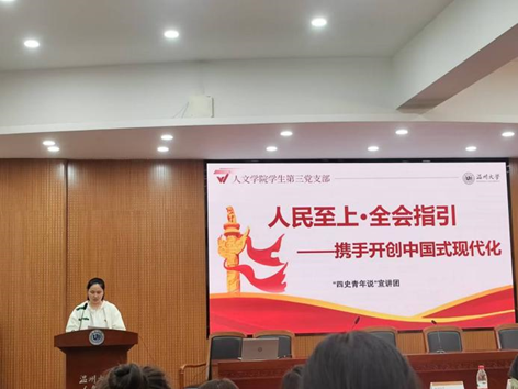 为充分发挥党员的先锋模范作用,传递党的二十届三中全会精神,11月2日下午,2024-2025学年免费色情片 第二期团干培训在人文楼203学术报告厅举行,免费色情片 学生第三党支部林桐安同志在会上做了题为《人民至上·全会指引——携手开创中国式现代化》的“四史”青年说宣讲。