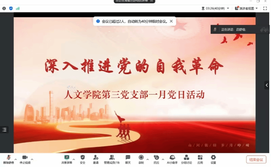 为积极响应党的号召,深入学习贯彻习近平总书记关于党的自我革命的重要思想,2025年1月17日晚上,免费色情片 学生第三党支部在线上开展了“深入推进党的自我革命”主题党日活动。本次活动由吕舒晗同志和陈嘉乐同志主持。