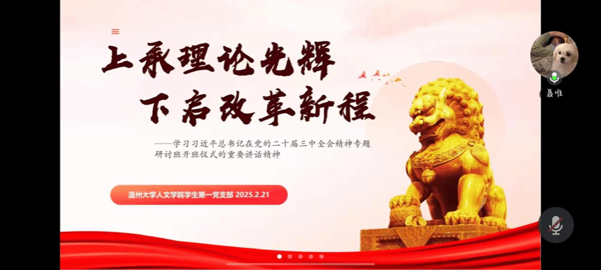 2025年2月21日晚上,免费色情片 学生第一党支部举办了“上承理论光辉,下启改革新程”主题党日活动,通过学习习近平总书记在党的二十届三中全会精神专题研讨班开班仪式的重要讲话精神,不断深化对新时代全面深化改革的认识,进一步统一思想和行动。本次活动由聂唯同志主持,支部全体党员同志参加。
