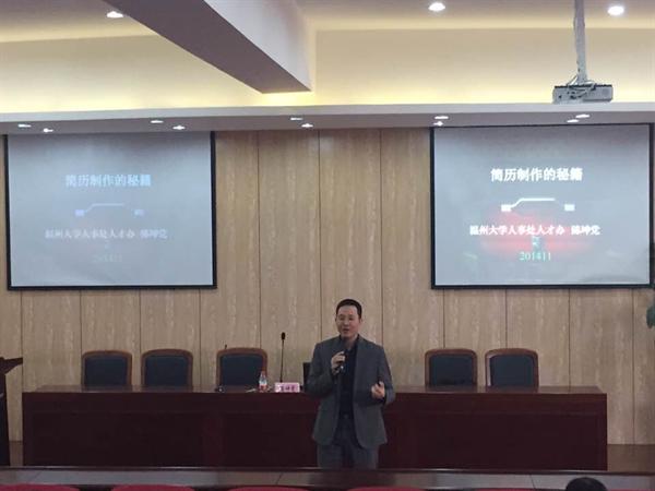 首先,陈坤党老师为同学们介绍了一些应当时时关注的网站,如事业单位的一些招聘网站温州市人才网,浙江省人才网,中国留学网,研究生人才网,有关企业单位招聘的中华英才网,智联招聘等。其次,陈老师详细地介绍了一份高品质的简历的制作要素要求,主要涵盖了个人信息、邮件标题、教育背景、奖励和荣誉、工作(实习)经历、科研情况、性格和爱好等七方面。陈老师从学生的实际情况出发,以中学教师和高校辅导员为例,介绍了相应的简历制作要求。再次,陈老师贴心的提出了一些细节性的注意事项,如纸张的选择、装订、打印字体、页面布局、长短句运用等问题。最后,陈老师用了一小时的时间,给同学们带去的简历做了一一会诊,同学们都受益匪浅。