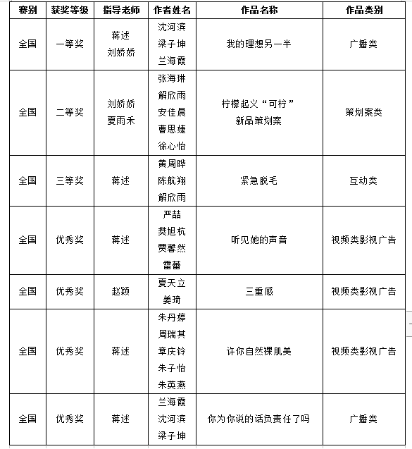 我校16广本学生沈河滨、梁子坤、兰海霞的作品《我的理想另一半》(指导师:蒋述、夏雨禾、刘娇娇老师)脱颖而出,荣获全国广播类一等奖。17广本张海琳、解欣雨、安佳晨、曹思婕、徐心怡的作品《柠檬起义“可柠”新品策划案》荣获全国策划案类二等奖;17广本黄周晔、陈航翔、解欣雨荣的作品《紧急脱毛》获全国互动类三等奖。