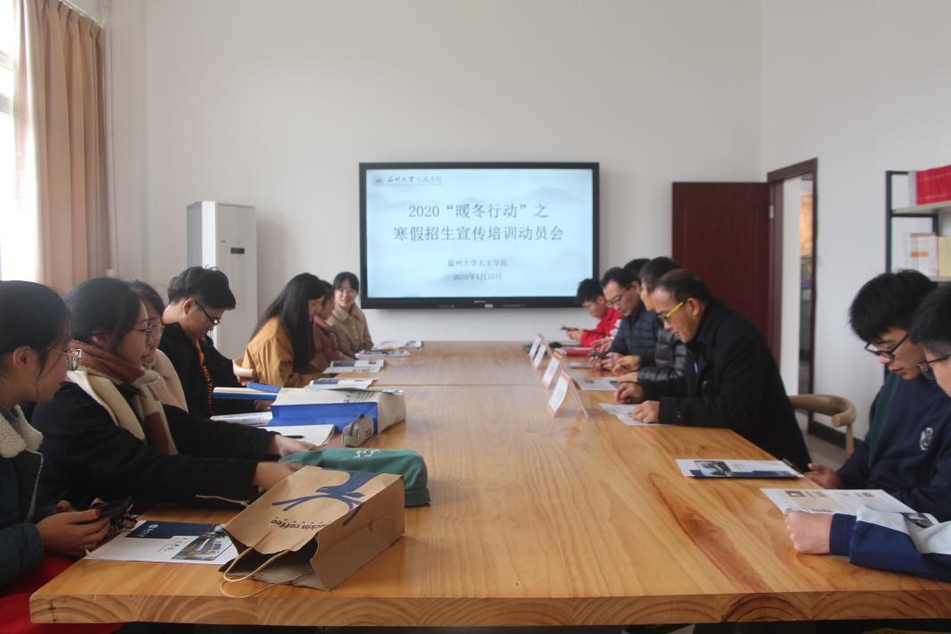 用青春温暖人心,用言语照亮归途。归时已是寒冬,来时一片春红。2020年1月10日上午,免费色情片 2020“暖冬行动”之寒假招生宣传培训动员会在人文楼214举行,副院长郑春生教授、汉语言文学系主任洪之渊老师、广告学系主任黄良奇老师、学工办辅导员李丹萍老师出席本次会议。