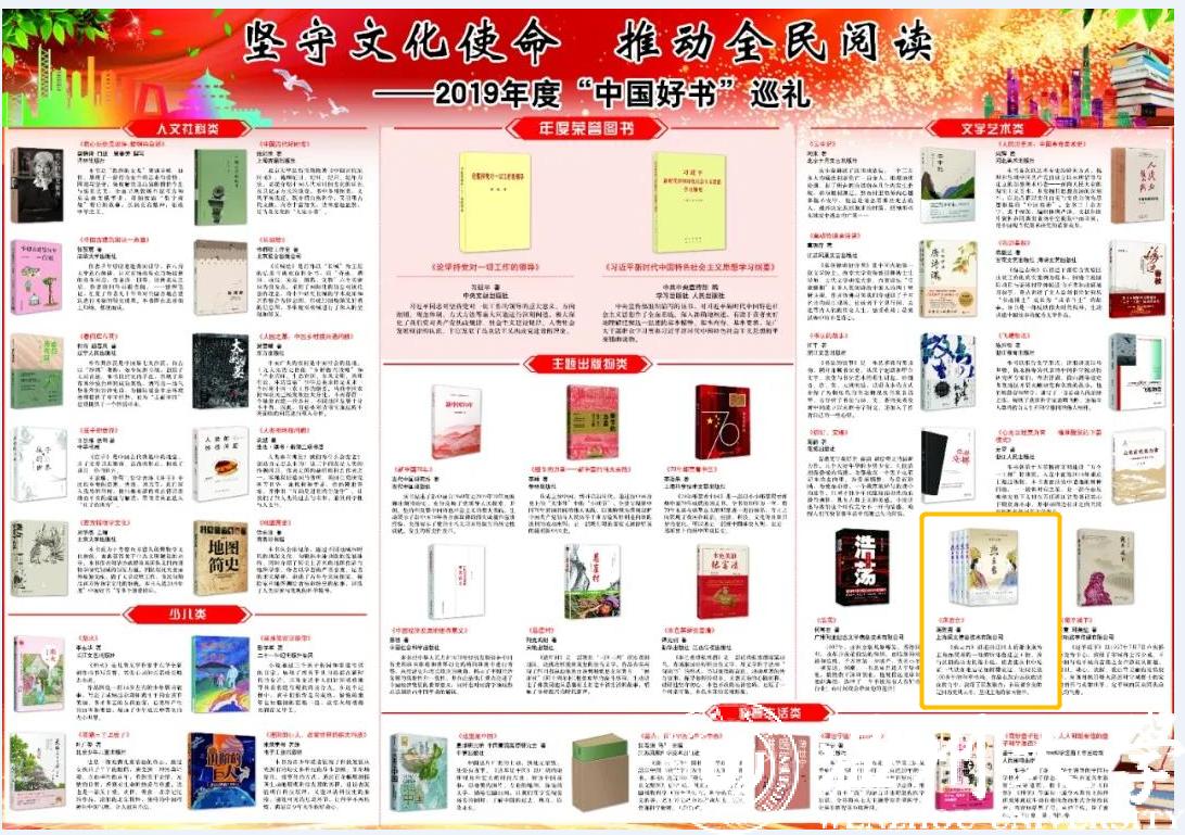 “中国好书”评选由中共中央宣传部指导、中国图书评论学会主办,以“为好书找读者,为读者找好书”为宗旨,自2014年举办迄今,已成为我国最权威的国家图书推荐榜和引领出版界、导航全民阅读的风向标。2019年度“中国好书”由专家、学者经过多轮评选最终投票产生,具体考量标准主要包括思想深度、文化品质、社会影响等方面。评选主办方表示,“中国好书”重点推荐的都是弘扬主旋律、传播正能量,具有较大社会影响、较高艺术水准,适合中国读者阅读趣味的精品原创图书。