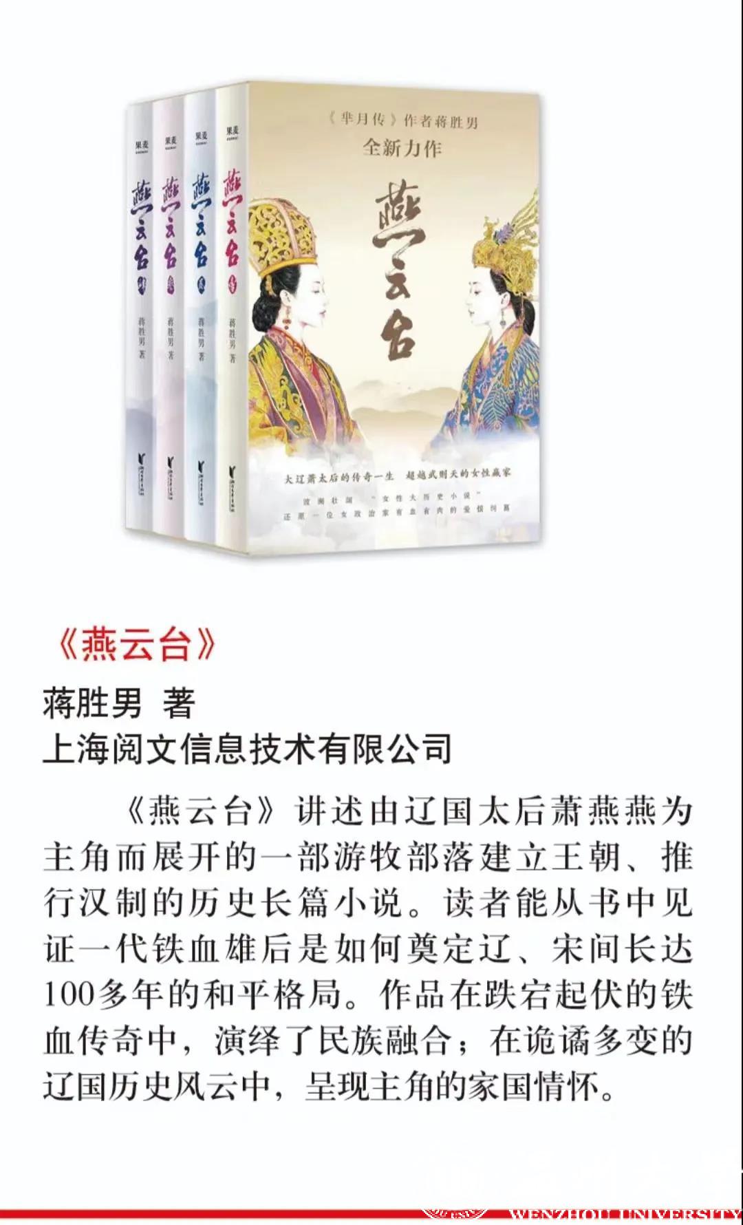 4月23日,在“2019年度中国好书”的评选中,由我校免费色情片 蒋胜男研究员所著、浙江文艺出版社出版的《燕云台》荣膺网络文学类“2019年度中国好书”荣誉。