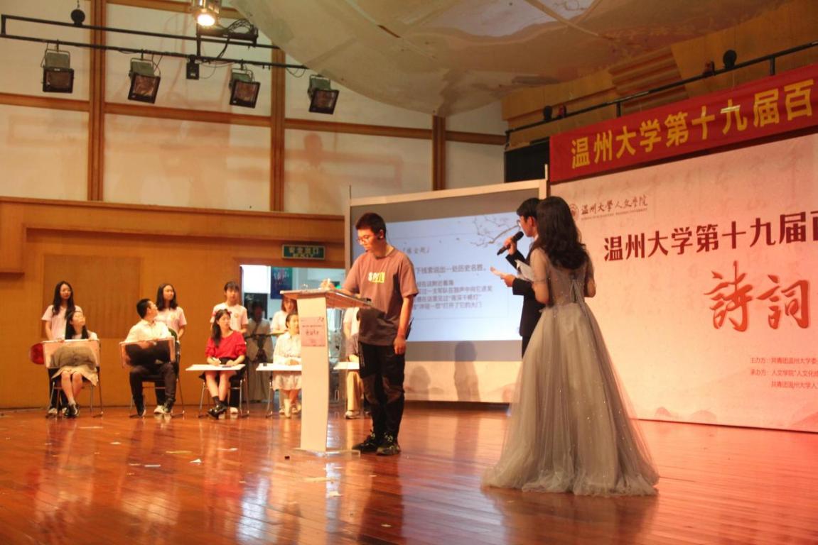 经初赛选拔,现场共有十五名选手进入决赛,根据初赛得分情况分别组成五人团、十人团。决赛分两轮进行。第一轮:“群雄逐鹿”,五人团选手依次上台答题,十人团选手共同作答五套题,两团各晋级两人进入第二轮角逐。紧凑的答题过程中,选手们的表现异常精彩,展现出极高的文学素养。同时,两位评委老师对题中个别诗句的经典阐释,每一位选手都受益匪浅。