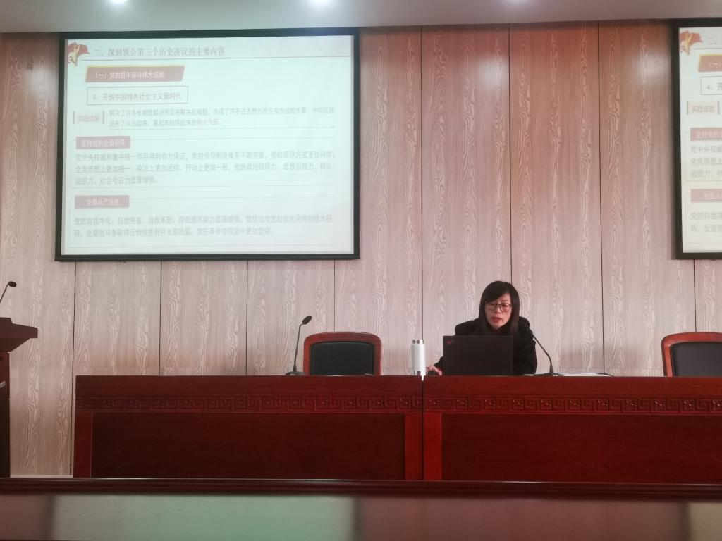 宣讲会的主题是《把思想和行动统一到党的历史决议上来——党的十九届六中全会精神解读》。吴静书记从深刻领会第三个历史决议的战略考量、深刻领会第三个历史决议的主要内容、深刻领会新时代新征程展现新作为新要求等三方面进行了深刻全面的阐释。