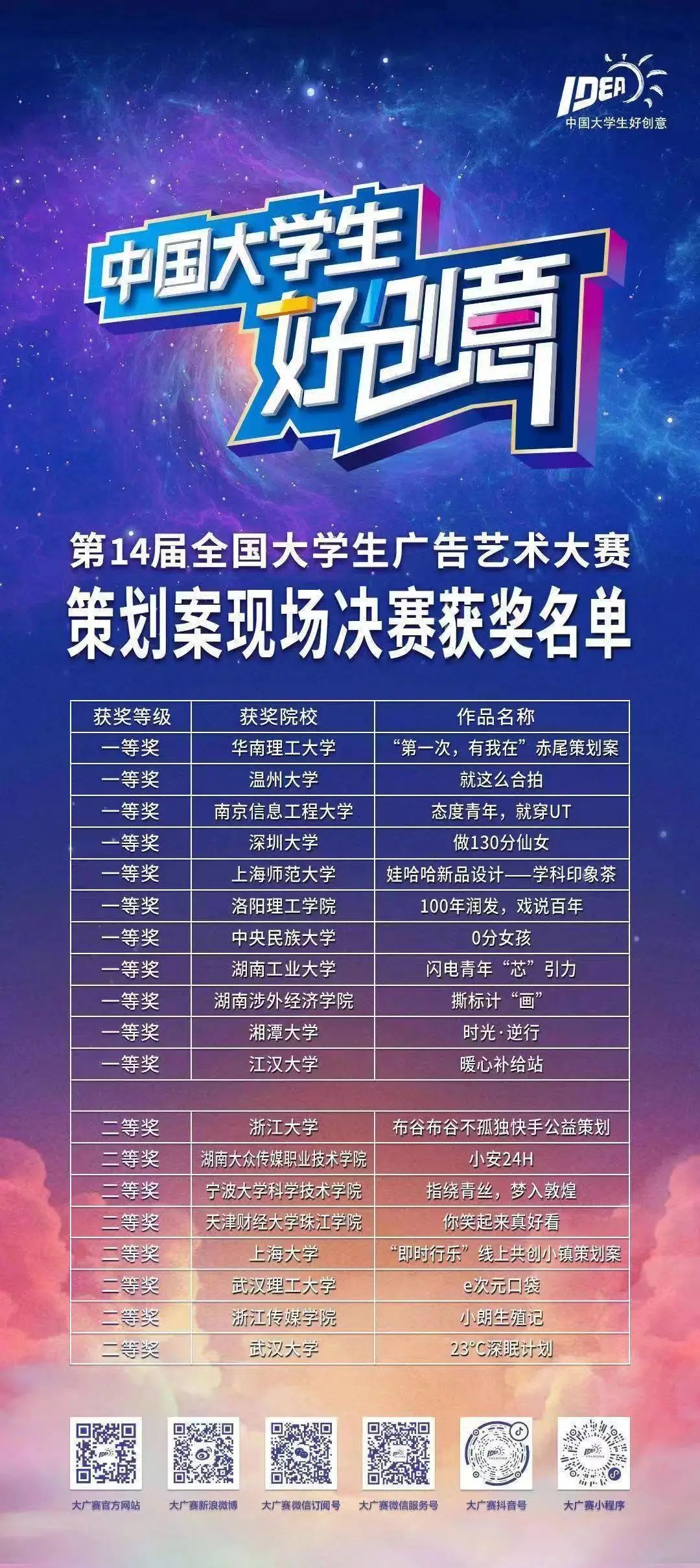 大广赛策划案类别比赛是全国大广赛中门类最复杂、要求最高的比赛类型,我校在该类型赛事上一向表现卓越,每一年都有策划案类别的全国等级奖项,今年除了决赛而出的《就这么合拍》一等奖,还有《中国可乐有“股气”》《现充青年》两项二等奖和《“银发冲浪”计划》等五项全国优秀奖。